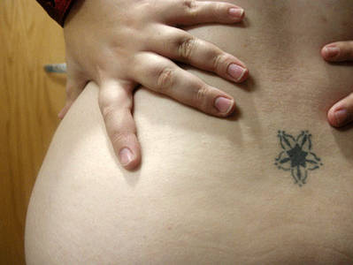 I found the photos I had of my two tattoos. The first one I got when I was 18 and it is on the small of my back: