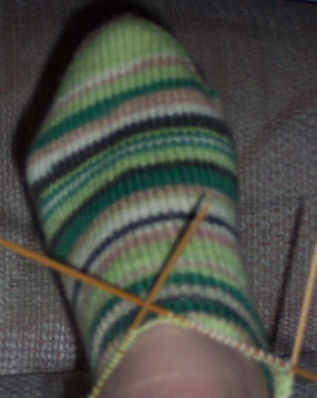 Okay, so its been a long time since I actually photographed any of my knitting. Here I present you with some photos of a sock in progress. I’m calling it the retro-stripe because of the colorway of the yarn. Something about 3 shades of green, tan and white that screams I (heart) the 70’s to me.