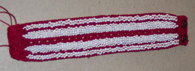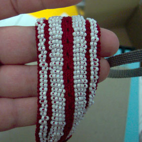 I finished MaryElla on Saturday, weaving in the ends of yarn used to sew on the snaps in the car on the way to the birthday celebration. I would’ve liked to get photos up before now, but with the sick and all, I just didn’t get to it. So, here they are now. I used a red perle cotton and opaque white beads with a rainbow-y shimmer to them. Nanie loved it, which was exciting. I don’t have a photo of it on as her wrists are smaller than mine.