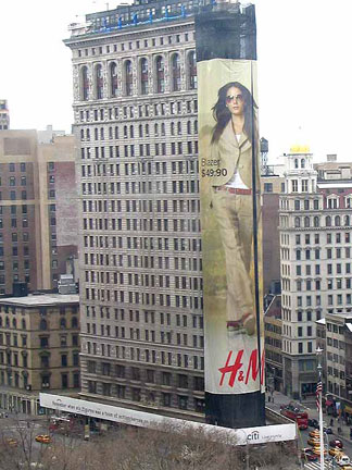 So, I was checking my email and I got a message from a colleague about the store H&M. In New York the company decided to take the famous Flatiron Building [done by Chicago Architects Daniel Burnham & Co. and one of my favorite buildings of all time] and dress it up with their advertising by running a huge ad up the entirety of the chamfered corner of the building. Also, not too many stories up from the ground a set of scaffolding was converted into a billboard for citibank wrapping completely around the building. It marred the building’s surface and was in complete disagreement with New York’s Landmark laws [it is listed as a New York landmark]. This person was so outraged they took the photograph of the advertising [in the extended entry] and sent it to the commission who reported back that it was, indeed, in violation and the company had been issued nine violations. Its nice to see that sometimes Historic Preservation and Landmarks Commissions have legal ability to protect against things like this. photos in the extended entry.