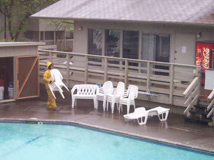 here’s the promised photo of the guy hauling out the plastic pool furniture in his slicker.