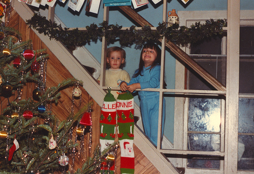 Kate blogged about knitting objects and whether or not we create them to be heirlooms and I left her a comment about my family’s tradition when it comes to our Christmas stockings. We all have striped, fair isle stockings knit for us, with our names and various characters embellishing them. She emailed asking for photos, and while I don’t have any recent, I do have some that were taken in 1982.
