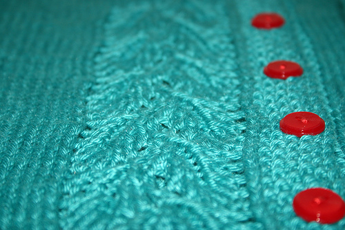 This is Kate Gilbert’s Pea Pod from Interweave Knits, knit in the six month size from Knitpick’s Shine Sport in Turquoise. I really like high contrast buttons, and when I was searching for buttons at JoAnn’s I thought these would be perfect…And machine washable. Highly necessary when dealing with baby knits, in my opinion. I haven’t gotten this mailed off to them yet, at this rate it might end up going as a Christmas gift, but it won’t be cold enough for him to wear it until about then anyway, nor will it fit for a bit yet.