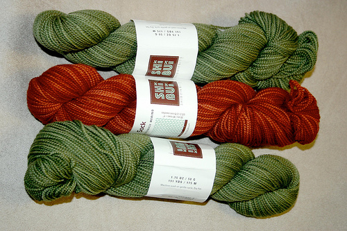 Now, my husband, bless his heart, has big feet. Size 13 wide big. So I knew if he was going to get the socks he wanted I’d better find some yarn (and a lot of it) that I’d enjoy knitting miles of sock with. I always seem to get the urge to buy yarn around nine o’clock at night, after everything local is closed so I’ve started buying yarn online from Knit/Purl. It’s semi-local (in Portland) and my orders arrive within 2-3 business days of placing an order. I think this was the third or fourth order I’ve placed with them since October or so and I’ve always been pleased. So while I wholly endorse the yarn shop, let’s talk about the yarn.