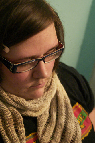 In November I ordered this single skein of Noro Silk Garden Sock yarn in color s269 from WEBS. Inspired directly by this clapotis scarf. I don’t normally go for pale neutrals like this but there is such amazing depth of color in this yarn. It’s Noro, so it’s a little “rustic” and there were two knots in the skein which didn’t bother me. I managed to use all but 4″ of this skein of yarn, something about which I am truly thrilled. And now, for a close up: