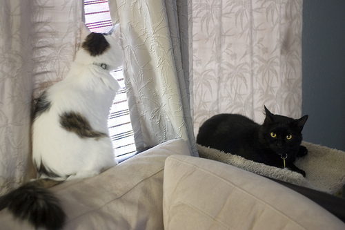 Almost a month ago, we got a second cat. We’ve been talking about getting one for awhile, to help with Pica’s co-dependent tendancies and just to round out our household a little more. We’ve been having a pretty ok adjustment time, generally. Pica still likes to growl, hiss and swat at Ollie but he now has the chutzpah to chase her back. He was very shy, but he’s stopped hiding for the most part. Except that tonight we realized that he’s been peeing on the rug directly in front of the litter box. We’re pretty sure he doesn’t have a uti and that it started sometime while we were away over last weekend. We’ve been cleaning it (the rug went into the washer and we treated the floor with water, water mixed with hydrogen peroxide and an enzymatic cleaner). Hopefully that will straighten things out. I love the cats, but boy, sometimes they are frustrating creatures!