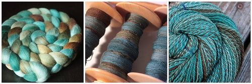 Secondly, 4 ounces of 21.5 micron merino in “Northern Pine” from Black Trillium, a Portland indie dyer. She mostly dyes yarns but her fiber is really awesome and less expensive than many other places I’ve come across. Again, beautiful colorways; she has a lot of gorgeous semi-solid colored yarns that make my heart go pitter-patter.