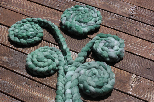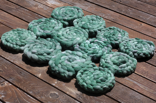 I split 4 ounces of roving into 1 ounce bundles and did some test dyeing in July after making a trip to the Eugene Textile Center to pick up some Jacquard Acid Dyes. With just a few tests I was able to settle on a color that I’m reasonably sure is one I love (if I change my mind once the yarn is spun, I can always over-dye it). Each 4 ounce roving was dyed once in silver grey and then over-dyed with a mixture of turquoise and kelly green. I’ve started the spinning, but it’s slow going as I’m easily distracted by my knitting. I did first spin a sample skein though. This wee skein is 1/2 ounce of three ply yarn and a dream to spin which is good, since there’s a lot of it to spin.