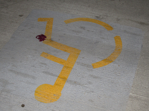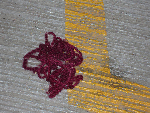 Remains of the Day July 31, 2011 Knitting 1 Seen in the parking garage when leaving Sock Summit late yesterday evening: That blob on parking guy’s knee there? Let’s take a closer look: Yup. Parking lot yarn detritus. The knitters were here.
