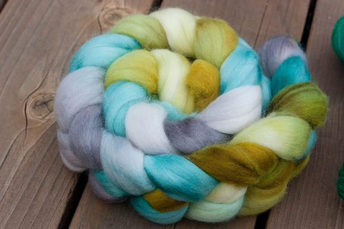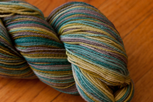 First, the fiber had a lot to do with it. The way many woolgatherings tops are dyed, the colors transition gradually between each other, and there are big chunks of each color. Starting with a top dyed in this nature makes a world of difference in getting a yarn that knits the way mine did.